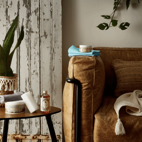 Appliquez une fine couche de Baume Cuir à l’aide d’un Carré Multi-usages propre, puis :